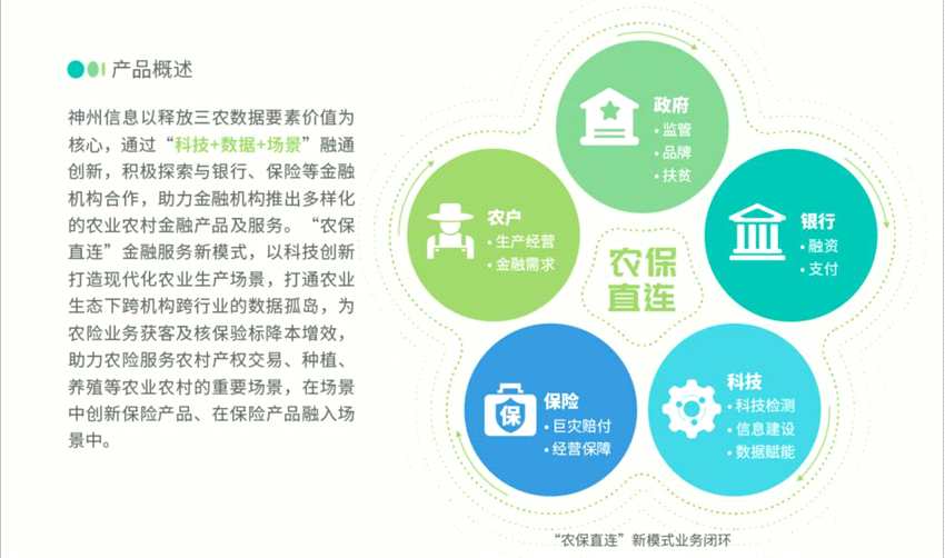 神州信息作為金融科技企業(yè),堅持自主創(chuàng)新,以大數(shù)據(jù)、人工智能、區(qū)塊鏈等數(shù)字技術(shù)融合應(yīng)用為支撐,不斷強(qiáng)化“科技+數(shù)據(jù)+場景”的創(chuàng)新模式,打造起包含“銀農(nóng)直連”、 “三農(nóng)金融大數(shù)據(jù)服務(wù)平臺”、“銀稅直連” 、“農(nóng)保直連”等產(chǎn)品及服務(wù)體系,幫助金融機(jī)構(gòu)服務(wù)新三農(nóng)和中小微企業(yè),賦能鄉(xiāng)村振興。