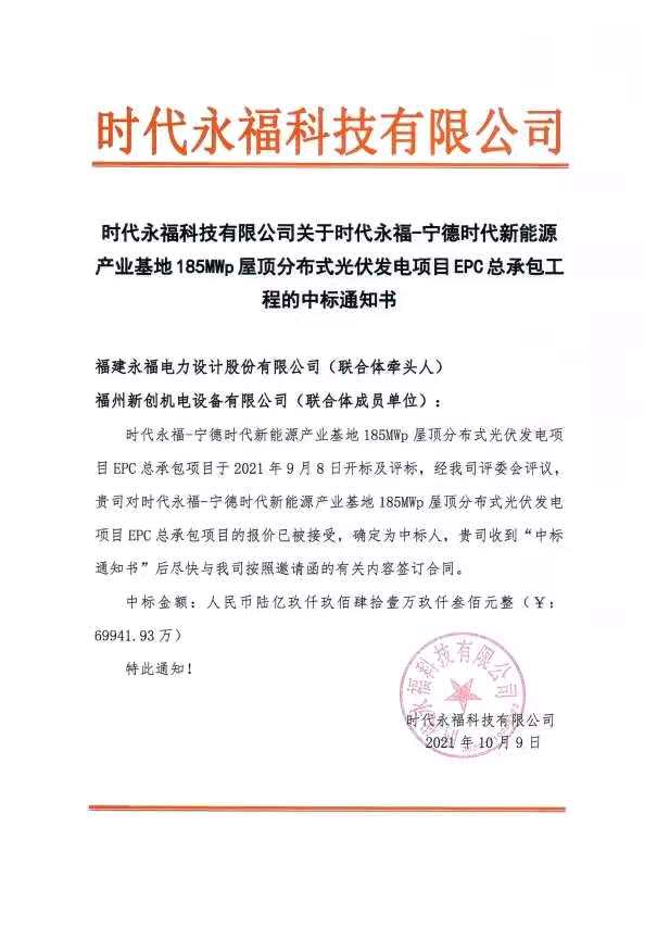 永福股份中標(biāo)時代永??萍加邢薰尽皶r代永福-寧德時代新能源產(chǎn)業(yè)基地185MWp屋頂分布式光伏發(fā)電項目EPC總承包工程”