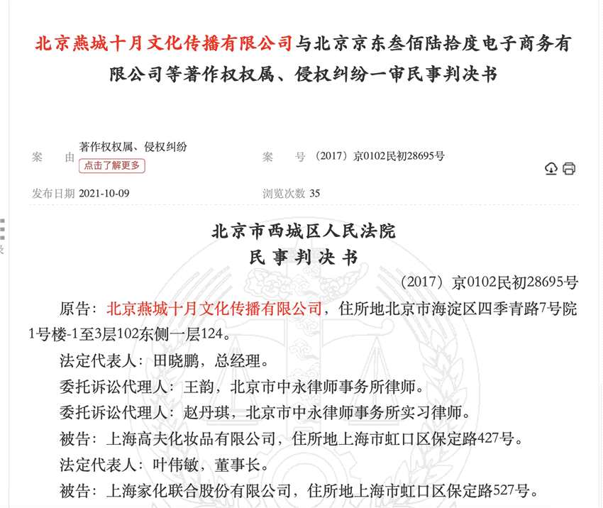 另據(jù)天眼查顯示,北京燕城十月文化傳播有限公司與上海高夫化妝品有限公司,上海家化聯(lián)合股份有限公司等相關(guān)著作權(quán)權(quán)屬、侵權(quán)糾紛,民事二審處于案件程序進(jìn)展中,開庭日期2021年4月20日。