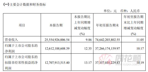 今日晚間,“股王”貴州茅臺(tái)(600519)發(fā)布了三季報(bào),今年1-9月公司實(shí)現(xiàn)營(yíng)收746.42億元,同比增長(zhǎng)11.05%,凈利372.66億元,同比增長(zhǎng)10.17%。