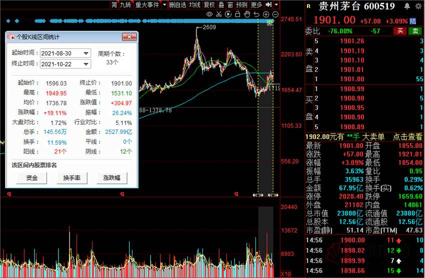 從近期股價(jià)走勢(shì)來看,貴州茅臺(tái)近兩個(gè)月股價(jià)出現(xiàn)反彈,從低點(diǎn)算起,截至今日收盤,已累計(jì)上漲19.35%,不過相比2609元的高點(diǎn),貴州茅臺(tái)股價(jià)還有一大段距離要走。