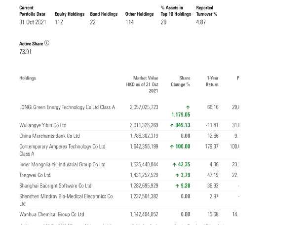與安聯(lián)神州A股基金形成鮮明對照,摩根大通旗下旗艦中國基金“摩根基金-中國A股機遇基金I(累計)-港元(JPMorgan Funds - China A-Share Opportunities Fund I (acc) – HKD)10月大手筆加倉。其中,加倉寧德時代幅度高達100%,加倉五糧液949.13%,加倉隆基股份(601012)更是高達1179.05%。此外,基金還加倉了伊利股份(600887)43.35%。