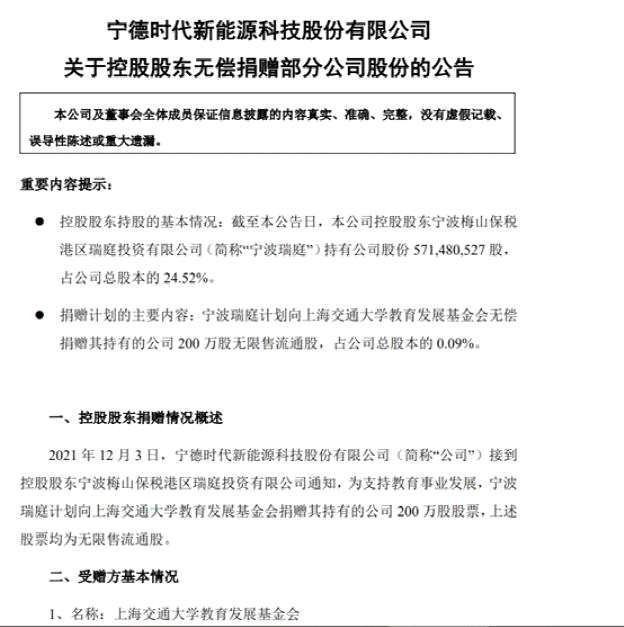 12月3日晚間,寧德時代發(fā)布《關于控股股東無償捐贈部分公司股份的公告》,稱接到控股股東寧波梅山保稅港區(qū)瑞庭投資有限公司通知,為支持教育事業(yè)發(fā)展,寧波瑞庭計劃向上海交通大學教育發(fā)展基金會無償捐贈其持有的公司200萬股股票,占寧德時代總股本0.09%。