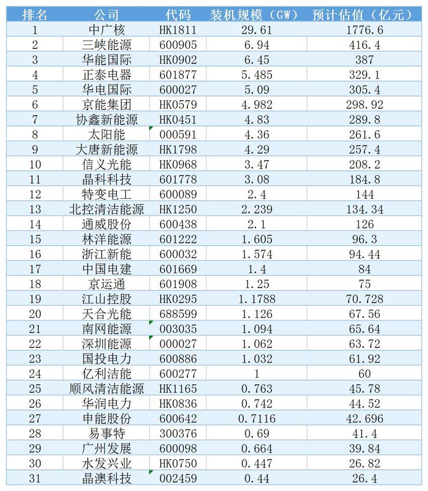 今年以來(lái)電力板塊特別是新能源運(yùn)營(yíng)商的上漲行情和其光伏或風(fēng)電裝機(jī)規(guī)模具有極其相關(guān)的關(guān)系。比如表格中的上市企業(yè):中廣核、三峽能源、華能國(guó)際、正泰電器、華電國(guó)際、京能集團(tuán)、協(xié)鑫新能源、太陽(yáng)能、大唐新能源、信義光能、晶科科技、特變電工、北控清潔能源、通威股份、林洋能源、浙江新能、中國(guó)電建、京運(yùn)通、江山控股、天合光能、南網(wǎng)能源、深圳能源、國(guó)投電力、億利潔能、順風(fēng)清潔能源、華潤(rùn)電力、申能股份、易事特、廣州發(fā)展、水發(fā)興業(yè)、晶澳科技。