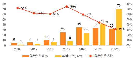 從2019年開(kāi)始,隆基一直在向整合的方向發(fā)展,到了2019年,硅片外銷的比例達(dá)到了75%,外銷的毛利達(dá)到了44%,我們預(yù)計(jì)22年及以后公司硅片外售量占比將降至30%左右,外售毛利在公司總毛利中占比將降低至15%左右,硅片的盈利波動(dòng)對(duì)公司的影響也會(huì)越來(lái)越小。