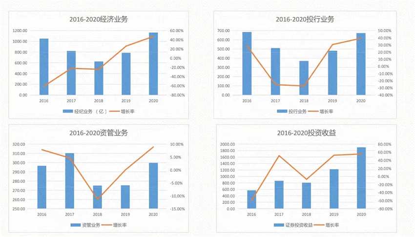 據(jù)中證協(xié)數(shù)據(jù),從2016年到2020年近五年券商行業(yè)營(yíng)業(yè)收入分別為3279.93=4/3113.28/2662.87/3604.83/4404.00億元,五年增長(zhǎng)34.27%。2016年證券經(jīng)紀(jì)業(yè)務(wù)、投行業(yè)務(wù)、投資收益、資管收益占比分別為32.10%、20.86%、17.33%、9.04%到2020年各項(xiàng)業(yè)務(wù)占比分別為26.36%、15.26%、6.8%、43.14%、8.43%,投資收益五年增長(zhǎng)近350%,衍生品交易貢獻(xiàn)量巨大,可見(jiàn)證券行業(yè)格局上可能已經(jīng)發(fā)生了根本變化。