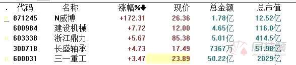 具體來(lái)看,北交所注冊(cè)制第一股威博液壓上市首日大漲172%,建設(shè)機(jī)械(600984)、浙江鼎力(603338)、三一重工(600031)等機(jī)械股全天強(qiáng)勢(shì)。