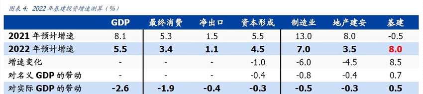 國(guó)盛證券預(yù)計(jì),2022年GDP目標(biāo)增速可能定在5.5%左右。由于今年消費(fèi)、凈出口,非基建投資增速均較去年有所下滑,因此基建投資增速可能需要8%左右。