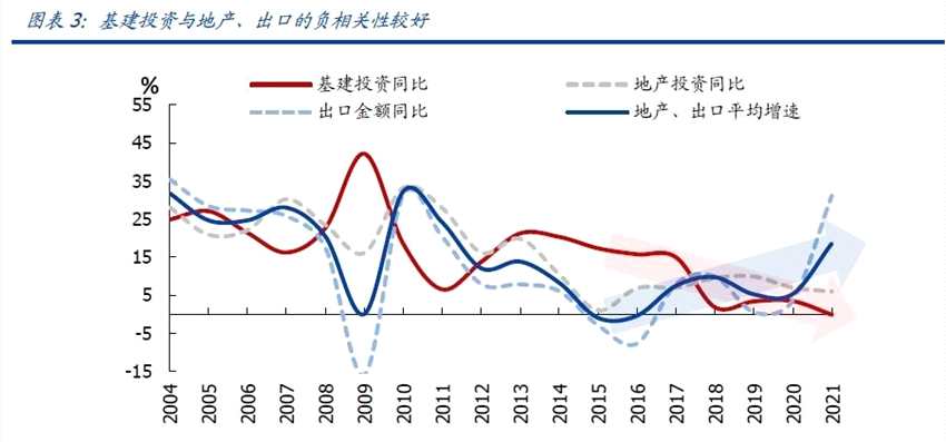 國(guó)盛證券認(rèn)為,基建投資主要對(duì)沖的是地產(chǎn)和出口下行,預(yù)計(jì)2022年地產(chǎn)和出口增速均將明顯下行,將倒逼基建投資高增。