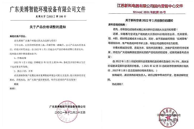 廣東美博智能環(huán)境設(shè)備有限公司(以下簡稱“美博空調(diào)”)和江蘇新科電器有限公司(以下簡稱“新科空調(diào)”)的漲價(jià)函在市場上流傳,宣布2022年1月1日起漲價(jià)。