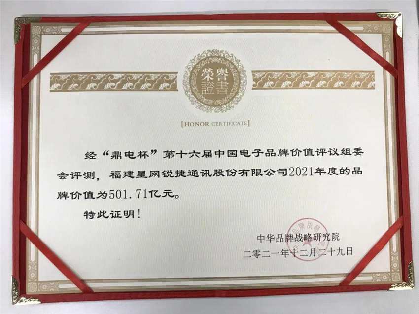 近日,由中華品牌戰(zhàn)略研究院公布了第十六屆中國電子企業(yè)品牌價(jià)值評議結(jié)果,【星網(wǎng)銳捷(002396)、股吧】(002396)品牌價(jià)值再創(chuàng)新高,突破500億元大關(guān),達(dá)到501.71億元,同比上年增長16.6%。