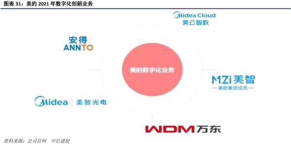 ?、?strong>數(shù)字化創(chuàng)新業(yè)務(wù)涵蓋美的在數(shù)字化程度推進(jìn)過程中,孵化或創(chuàng)新的產(chǎn)品業(yè)務(wù)模式。包含美云智數(shù)、安得物流、美智光電、美智與【萬東醫(yī)療(600055)、股吧】五大業(yè)務(wù)。(百億級(jí),考慮醫(yī)療則千億級(jí))