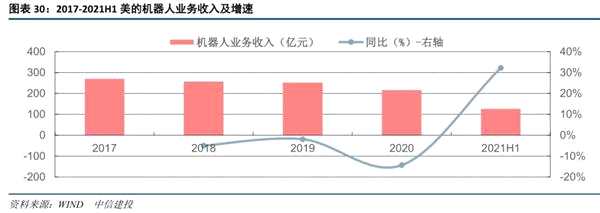 美的收購(gòu)庫(kù)卡后資本市場(chǎng)曾對(duì)其充滿較高的期待,但是后來一方面國(guó)外汽車行業(yè)景氣度度較低,導(dǎo)致庫(kù)卡需求下降,另一方面庫(kù)卡整合進(jìn)度整體低于預(yù)期。美的機(jī)器人業(yè)務(wù)板塊收入規(guī)模近年來持續(xù)降低。2021年上半年該業(yè)務(wù)觸底反彈,重新恢復(fù)增長(zhǎng)。