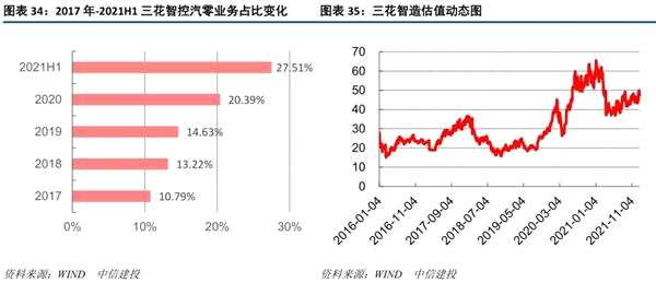 2017年公司通過收購(gòu)集團(tuán)的汽零資產(chǎn)進(jìn)軍汽車零部件業(yè)務(wù),后獲得特斯拉等知名公司訂單。汽車零部件業(yè)務(wù)和家用空調(diào)零部件業(yè)務(wù)底層技術(shù)相通(閥件較為類似,差異化較大的壓縮機(jī)底層原理相同,最終都是通過壓力差將低溫“媒介”轉(zhuǎn)換成高溫“媒介”,利用過程中的吸熱放熱來調(diào)節(jié)溫度,都有類似重要的部件,如軸承,即轉(zhuǎn)子,差別在于驅(qū)動(dòng)“媒介”的動(dòng)力來源不同)。在此期間,公司估值體系不斷重塑,整體估值體系從原來的20倍提升至35倍。即使按照目前的業(yè)務(wù)占比看,汽車零部件業(yè)務(wù)比重也僅僅27%。