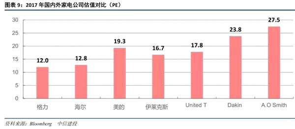 從事后來看,2017年也是家電板塊第一次實(shí)現(xiàn)了整體的估值躍升,從10倍估值中樞跨越進(jìn)入15倍估值中樞的一年。市場(chǎng)開始逐步修正此前“家電行業(yè)理應(yīng)低估值”的認(rèn)知,將國(guó)外家電公司的估值體系進(jìn)行橫向?qū)Ρ?,認(rèn)為中國(guó)家電企業(yè)增長(zhǎng)空間比國(guó)外的更大、全球競(jìng)爭(zhēng)力更強(qiáng),估值卻顯著低于國(guó)外公司是不合理的。