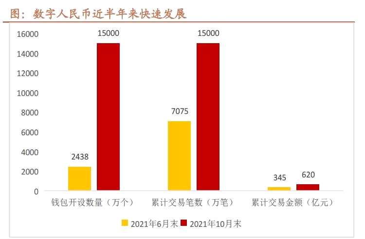 2021年二季度以來(lái),市場(chǎng)對(duì)于數(shù)字人民幣的認(rèn)可度不斷上升。根據(jù)央行披露的數(shù)據(jù),截至2021年10月末,數(shù)字人民幣錢(qián)包累計(jì)開(kāi)設(shè)1.5億個(gè),累計(jì)交易1.5億筆,金額合計(jì)620億元。