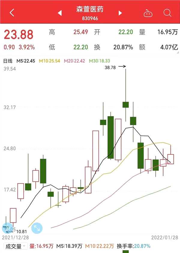 1月,森萱醫(yī)藥因為可生產(chǎn)利托那韋系列中間體而被市場冠以輝瑞“新冠特效藥”概念,截至1月20日股價累計上漲81.82%。然而就在股價高企之際,1月21日,公司董事高管宣布減持,擬合計減持不超過7.5萬股,比例不超過0.0177%。隨后該股股價進入回調(diào),累計跌幅20.51%。