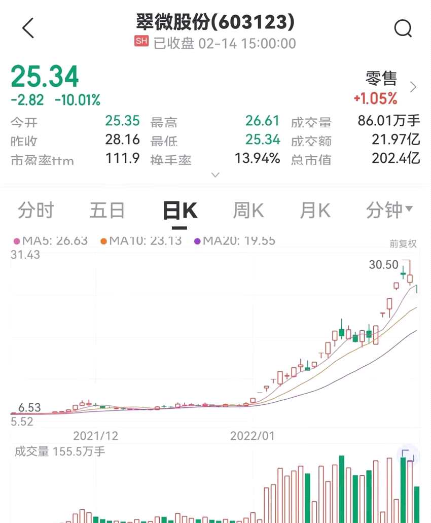 2月14日,數(shù)字貨幣龍頭股翠微股份(603123)放量跌停。在數(shù)字貨幣概念刺激下,近期翠微股份持續(xù)暴漲,25天收獲15個漲停板,年初以來漲逾兩倍。