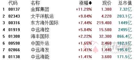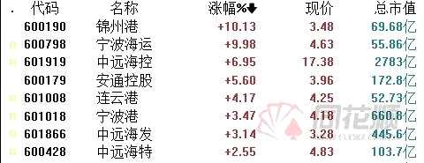 截至發(fā)稿,A股錦州港(600190)、寧波海運(600798)漲停,中遠??兀?01919)漲幅居前。