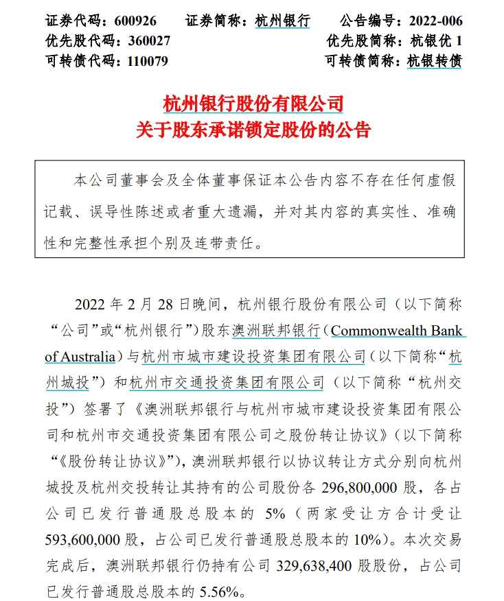 公告顯示,此次股份變動(dòng)前,澳洲聯(lián)邦銀行為杭州銀行第一大股東,持股比例為15.57%。交易完成后,澳洲聯(lián)邦銀行持股比例降至5.56%。澳洲聯(lián)邦銀行承諾,本次交易完成后,其不會(huì)在相關(guān)協(xié)議簽署之日起三年內(nèi)(2022年2月28日至2025年2月28日),處置其持有的任何杭州銀行股份(本次交易相關(guān)股份除外)。