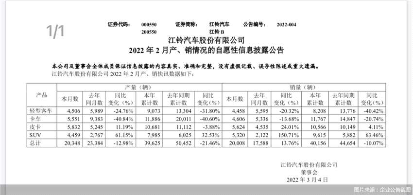 ?。ㄓ浾?劉曉夢)3月3日,江鈴汽車(000550)發(fā)布數(shù)據(jù)顯示,今年2月產(chǎn)量為2.03萬輛,同比下降12.98%;銷量超2萬輛,同比增長13.76%。