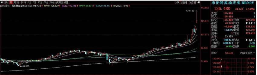 受消息刺激,周一開盤布倫特原油跳空高開,盤中一度漲超10%,截至發(fā)稿漲幅有所收窄,但仍漲逾7%,報(bào)126.48美元,創(chuàng)2011年以來新高,步步逼近2008年的歷史最高位。