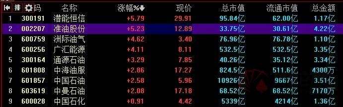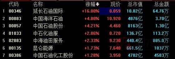 港股方面,延長(zhǎng)石油國(guó)際漲超10%領(lǐng)漲,中海油、中石油等跟漲。