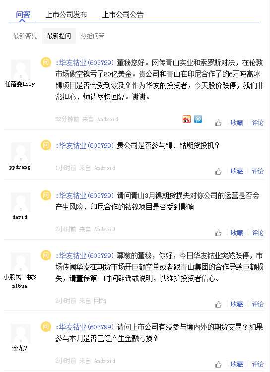 在互動(dòng)平臺(tái)上,至少有8位投資者就相關(guān)問(wèn)題進(jìn)行提問(wèn),有投資者提問(wèn)稱(chēng)“請(qǐng)董秘第一時(shí)間辟謠或說(shuō)明,以維護(hù)投資者信心”,有投資者提問(wèn)稱(chēng)“貴公司和青山在印尼合作了的6萬(wàn)噸高冰鎳項(xiàng)目是否會(huì)受到波及?”還有投資者提問(wèn)稱(chēng)“青山期貨事件對(duì)公司鎳資源獲取是否構(gòu)成重大不利影響?”。