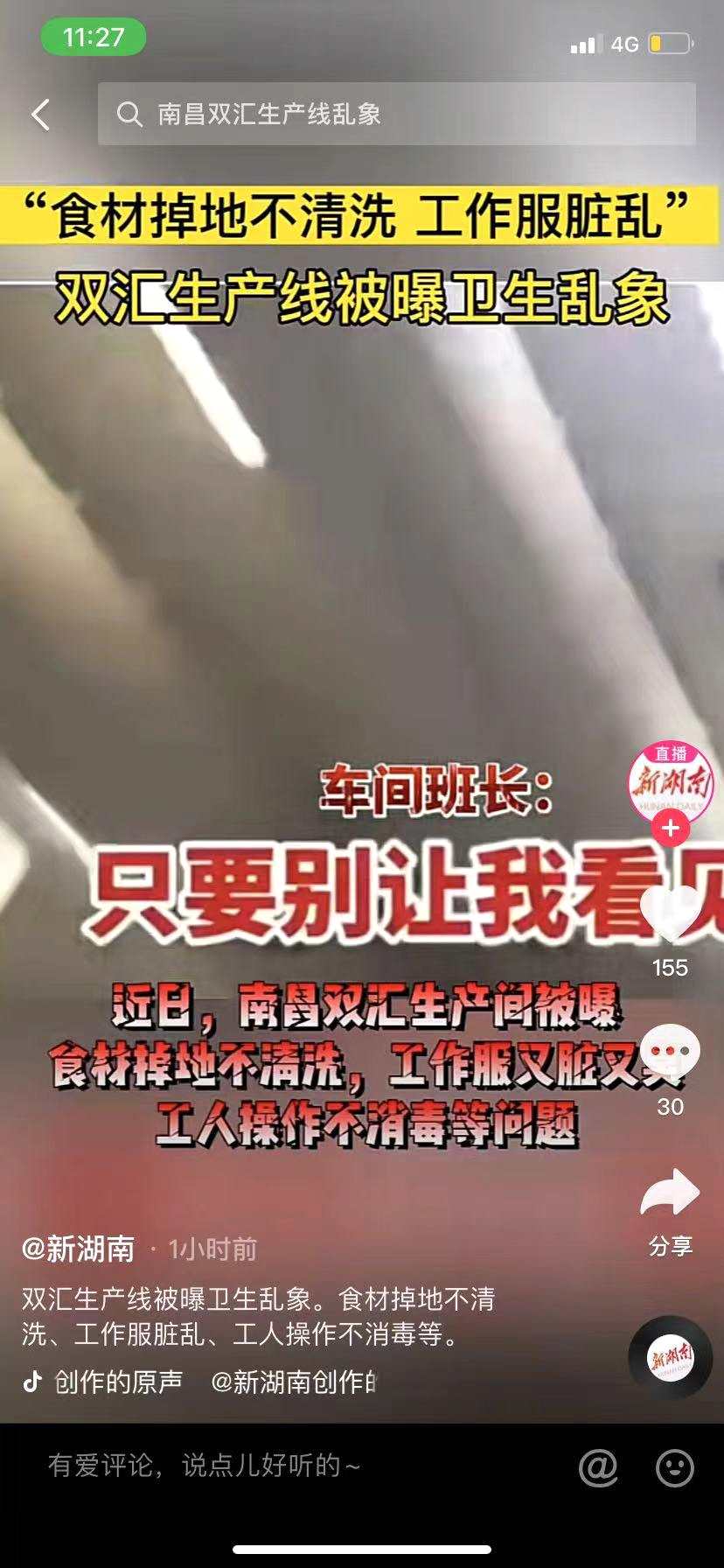同時(shí),短視頻平臺(tái)上也有不少南昌雙匯相關(guān)視頻。視頻中,車間班長(zhǎng)稱“只要?jiǎng)e讓我看見(衛(wèi)生亂象)”。