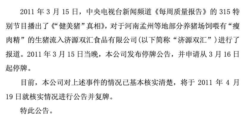 該事件對(duì)雙匯發(fā)展造成重大創(chuàng)傷,當(dāng)天雙匯發(fā)展股價(jià)跌停,公司還因此停牌一個(gè)多月。
