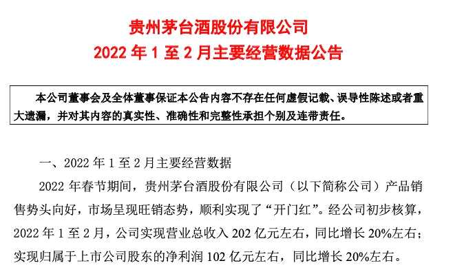 貴州茅臺(tái)公告顯示,經(jīng)初步核算,2022年1-2月,公司實(shí)現(xiàn)營(yíng)業(yè)總收入202億元左右,同比增長(zhǎng)20%左右;實(shí)現(xiàn)歸母凈利潤(rùn)102億元左右,同比增長(zhǎng)20%左右。
