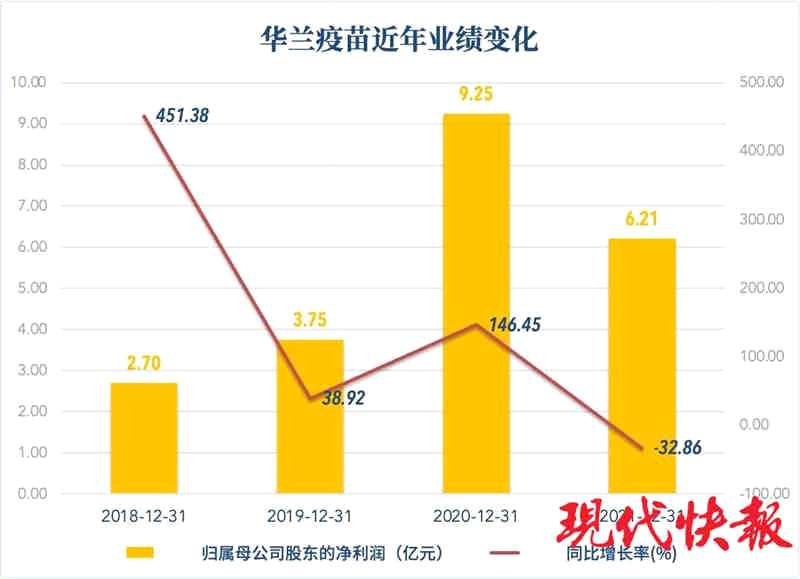上市之前,2018年到2020年,華蘭疫苗業(yè)績高速增長,三年凈利潤增長率分別達到451.38%、38.92%、146.45%。但上市后僅僅一個多月,公司披露的2021年年報就出現(xiàn)了下滑。年報顯示,公司去年實現(xiàn)營收18.3億元,歸屬凈利潤6.21億元,同比分別下滑24.59%和32.86%??鄯莾衾麧?.85億元,同比下滑34.88%。單季度業(yè)績顯示,其去年四季度營收和凈利潤分別為4.37億元和9280萬元,同比分別下滑66.85%和81.91%。