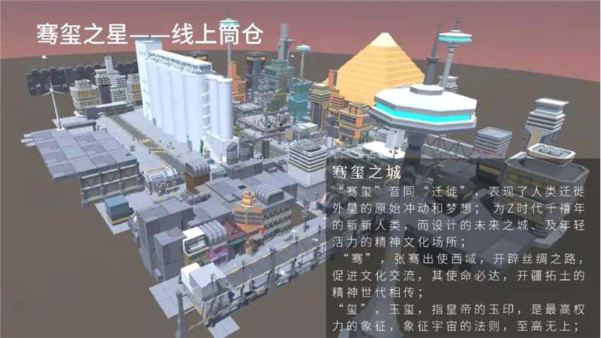 “騫璽”音同“遷徙”,表現(xiàn)了人類遷徙外星的原始沖動和夢想;為Z時代千禧年的新新人類而設(shè)計的未來之城以及年輕活力的精神文化場所。