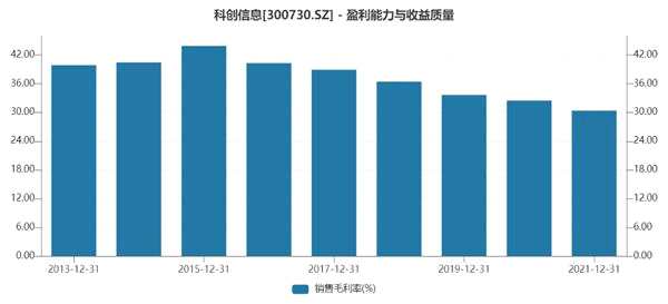 數(shù)據(jù)顯示,2021年,科創(chuàng)信息銷售毛利率為30.39%,為2013年以來新低,公司2017年上市后,銷售毛利率持續(xù)下滑。