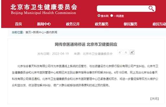 4月19日,北京市衛(wèi)健委對此表示回應(yīng),稱北京市衛(wèi)健委和北京市醫(yī)院管理中心前期已關(guān)注到此事并指導(dǎo)當事方積極解決糾紛,已緊急通知雙方,將進一步督促指導(dǎo)雙方從維護公眾利益出發(fā),依法理性解決糾紛,使廣大群眾能夠繼續(xù)獲得便利的線上預(yù)約服務(wù)。
