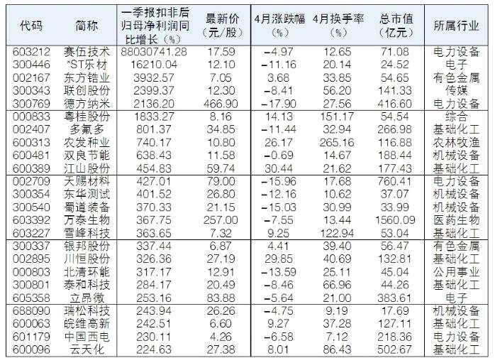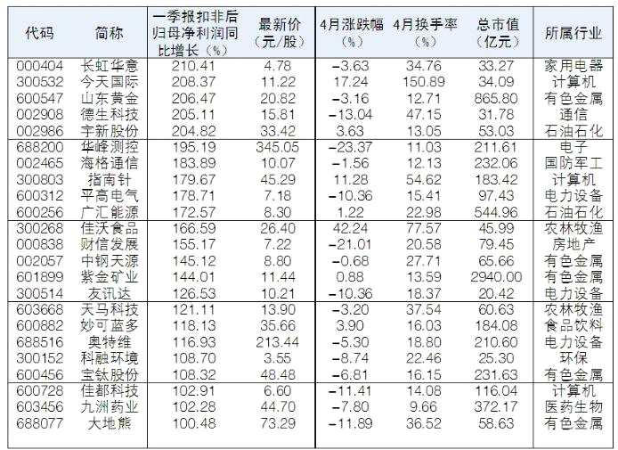 根據(jù)Wind數(shù)據(jù)統(tǒng)計,截至昨日,兩市已有271家公司披露一季報。其中,47家公司扣非后歸母凈利同比增速超過100%。從二級市場來看,佳沃食品(行情300268,診股)、江山股份(行情600389,診股)、川恒股份(行情002895,診股)、農(nóng)發(fā)種業(yè)(行情600313,診股)4月漲幅均超過20%。