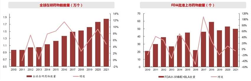 2010-2020年,全球在研藥物數(shù)量從9737個增長到17697個,復(fù)合增速達(dá)到6.16%,2021年全球在研藥物數(shù)量達(dá)到18582個,同比增長4.76%,預(yù)計未來仍將以3%-6%的速度增長。