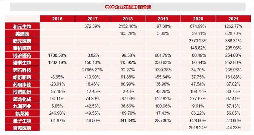 從在建工程增速來看,2021年和元生物、【美迪西(688202)、股吧】、皓元醫(yī)藥、泰格醫(yī)藥等幾家企業(yè)增速較快,主要由于在建實驗室面積、實驗動物房面積、生產(chǎn)基地產(chǎn)能高速擴張所致;博濟醫(yī)藥(300404)、諾泰生物、藥石科技(300725)也都保持230%以上的增速。