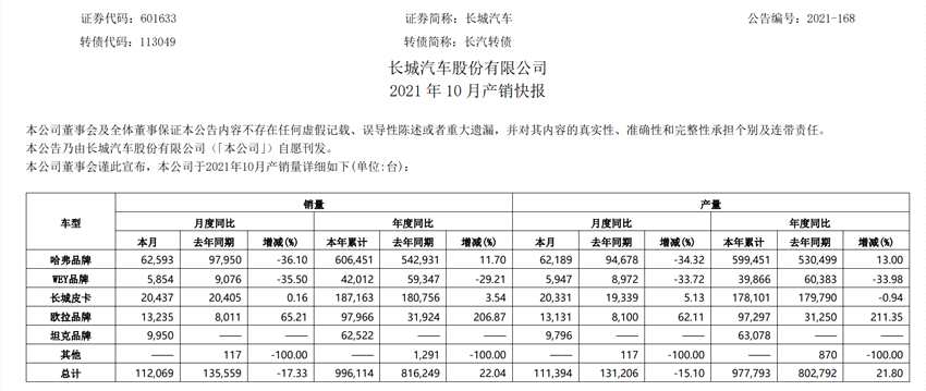 而近期出臺的4月產(chǎn)銷報告中,公司4月銷量53,777輛,同比-41.4%。分品牌看,哈弗品牌4月銷量29,125輛,同比-47.1%;WEY品牌銷量2,293輛,同比-36.1%;長城皮卡銷量13,206輛,同比-34.6%;歐拉品牌銷量3,088輛,同比-58.7%;坦克品牌銷量6,065輛,同比+10.3%。