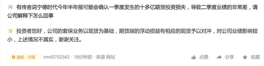 寧德時代:“半年報可能會確認(rèn)一季度發(fā)生的十多億期貨投資損失 導(dǎo)致二季度業(yè)績非常差”的傳言不屬實(shí)