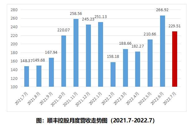 8月18日晚間,【順豐控股(002352)、股吧】(002352)發(fā)布7月份經(jīng)營(yíng)簡(jiǎn)報(bào),順豐控股在7月份仍保持了穩(wěn)定增長(zhǎng)的態(tài)勢(shì),實(shí)現(xiàn)合計(jì)營(yíng)收229.51億元,同比增加54.69%。其中,速運(yùn)業(yè)務(wù)營(yíng)收147.59億元,同比增長(zhǎng)13.52%,繼續(xù)保持了兩位數(shù)的同比增長(zhǎng);業(yè)務(wù)量9.21億票,同比增長(zhǎng)8.87%;單票收入達(dá)到16.02元/票,同比增長(zhǎng)4.23%,連續(xù)9個(gè)月正增長(zhǎng); 國(guó)際及供應(yīng)鏈業(yè)務(wù)營(yíng)收81.92億元,同比增長(zhǎng)346.19%。