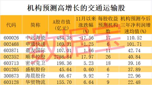 從機構(gòu)關(guān)注度來看,機構(gòu)評級次數(shù)最多的是圓通速遞,共27家券商研報提及該股。其次是【順豐控股(002352)、股吧】、韻達股份、春秋航空、密爾克衛(wèi)等。按照5家以上機構(gòu)一致預(yù)測,機構(gòu)預(yù)測今后3年凈利潤增速均超20%的有8股。最新收盤價與年內(nèi)高點相比,中遠海能、盛航股份、申通快遞、密爾克衛(wèi)、順豐控股、海晨股份等回撤幅度超20%。