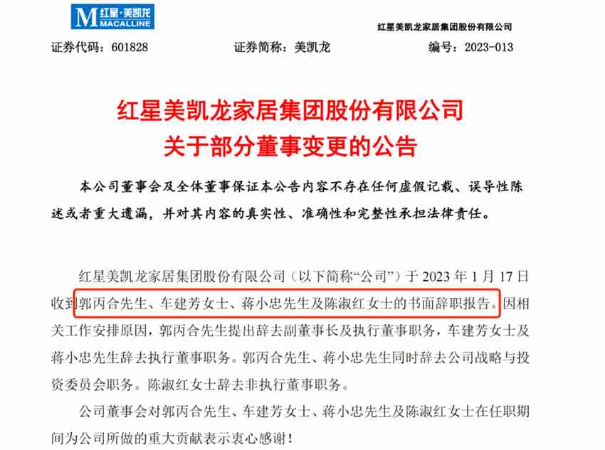 對于空缺位置,美凱龍計劃增補3名非執(zhí)行董事和1名執(zhí)行董事。經紅星控股提名,提名委員會審查同意,2023年1月18日,公司召開第四屆董事會第五十七次臨時會議,審議通過董事增補方案。