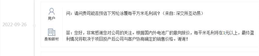 而泰和新材2022年9月26日在互動平臺表示,根據(jù)國內(nèi)外電池廠的意向報價,芳綸涂覆每平方米毛利將在1元以上,最終盈利情況將取決于項目投產(chǎn)后公司與客戶協(xié)商確定的銷售價格。