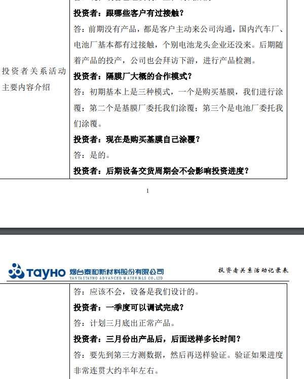 針對芳綸涂覆業(yè)務(wù),已經(jīng)有很多機構(gòu)投資者注意到了這一投資機會,在2月3日的投資者關(guān)系活動記錄表中,泰和新材表示,在公司還沒有產(chǎn)品時,汽車廠、紛紛主動上門,除了個別電池龍頭,均已與公司有過接觸。而23年3月,泰和新材就將正式產(chǎn)出涂覆產(chǎn)品,順利的話,年底就可以完成送樣流程。
