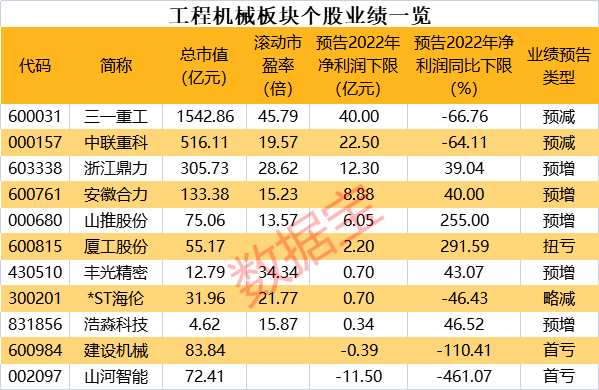 數(shù)據(jù)寶統(tǒng)計(jì),A股申萬工程機(jī)械板塊31只個股,板塊平均市盈率30.12倍,中聯(lián)重科、杭叉集團(tuán)、柳工等14股低于20倍。截至目前, 11股公布了2022年業(yè)績情況,6只預(yù)喜 (包含扭虧、略增和預(yù)增),占比超五成。
