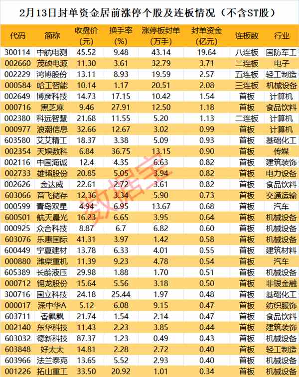 從收盤漲停板封單量來看,中航電測最受資金追捧,收盤漲停板封單有43.14萬手,其次是茂碩電源、鴻博股份等,漲停板封單分別為32.79萬手、19.59萬手。以封單金額計(jì)算,中航電測、茂碩電源、鴻博股份漲停板封單資金居前,分別有19.64億元、3.71億元、2.57億元。