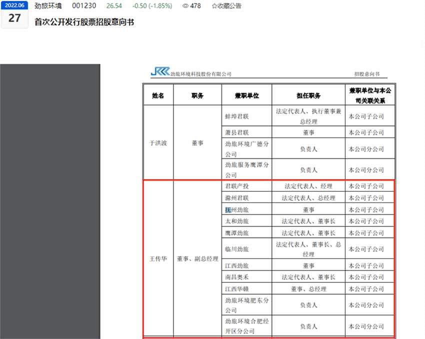 招股意向書還顯示,王傳華在勁旅環(huán)境多家子公司、分公司擔(dān)任法定代表人、董事長(zhǎng)、總經(jīng)理、負(fù)責(zé)人等要職。