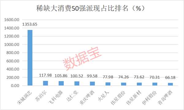 能賺錢、會(huì)賺錢,50強(qiáng)股票對(duì)股東也超級(jí)大方,去年派現(xiàn)比例中位數(shù)高達(dá)49%,高出A股派現(xiàn)公司派現(xiàn)比例中位數(shù)16個(gè)多百分點(diǎn)。其中,宋城演藝、蘇泊爾、飛科電器、達(dá)仁堂等公司派現(xiàn)比例在100%以上,重慶啤酒、火星人、偉星股份等公司派現(xiàn)比例超過70%。
