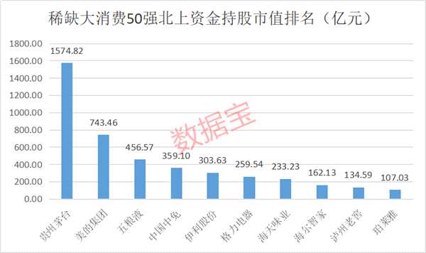稀缺大消費(fèi)50強(qiáng)股票的優(yōu)質(zhì)特質(zhì),吸引了眾多機(jī)構(gòu)的青睞。其中市值最高的貴州茅臺(tái)一季度末獲得了1700多家機(jī)構(gòu)持倉(cāng),五糧液獲得了1000多家機(jī)構(gòu)持倉(cāng)。即便是市值最低的偉星股份,也有20多家機(jī)構(gòu)重倉(cāng)。北上資金也是持倉(cāng)大戶,持有50強(qiáng)股票最新市值超過5291億元,貴州茅臺(tái)、美的集團(tuán)、五糧液等個(gè)股最新持股市值均超400億元。